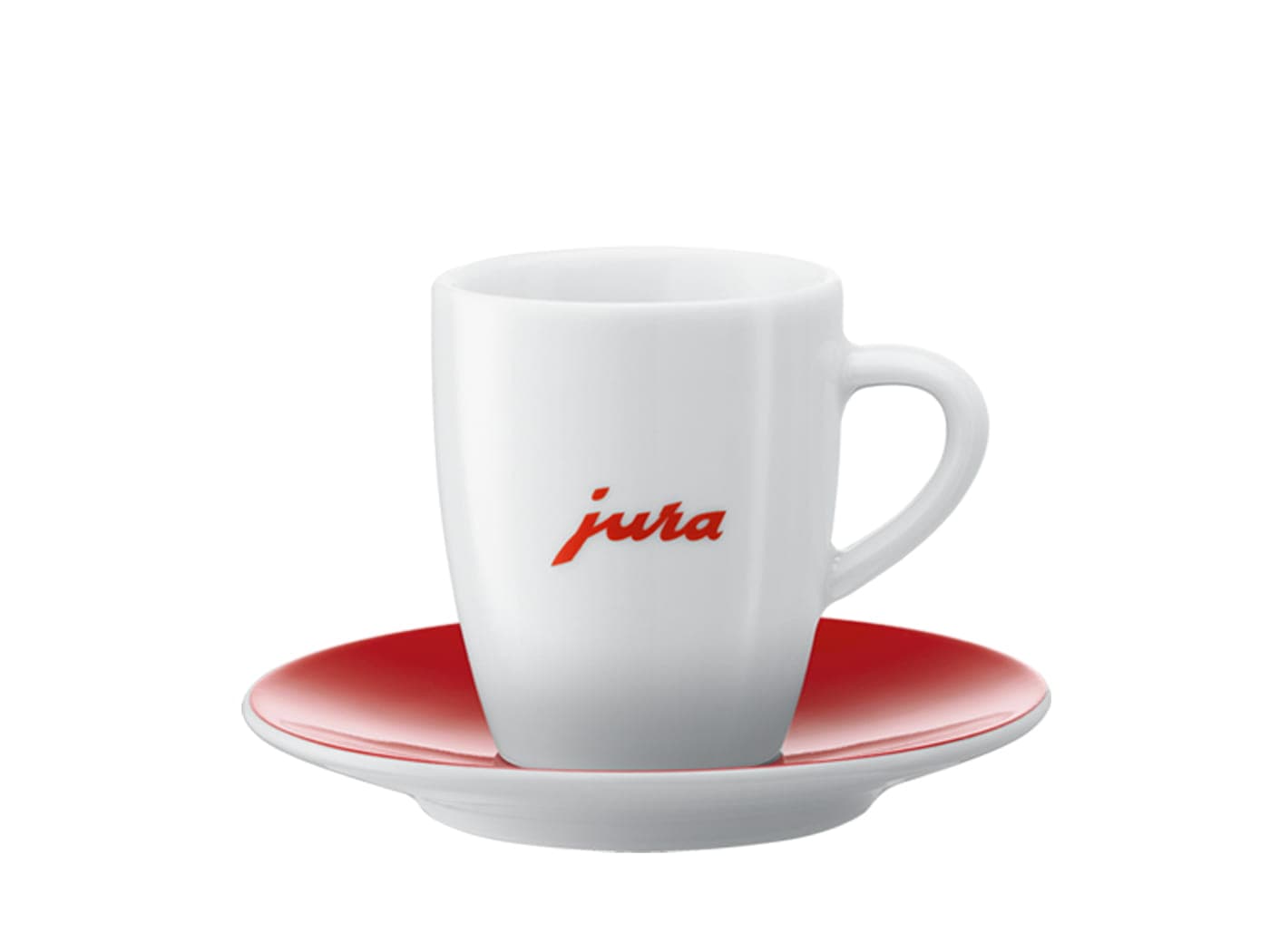 Setzen Sie Ihre Kaffeespezialität mit der in edlem JURA-Design gehaltenen, gebrandeten Espresso-Tasse und dem passenden roten Unterteller optimal in Szene. Das exklusiv für JURA entworfene Set à 2 Tassen macht das Kaffeetrinken auch optisch zum Genuss.