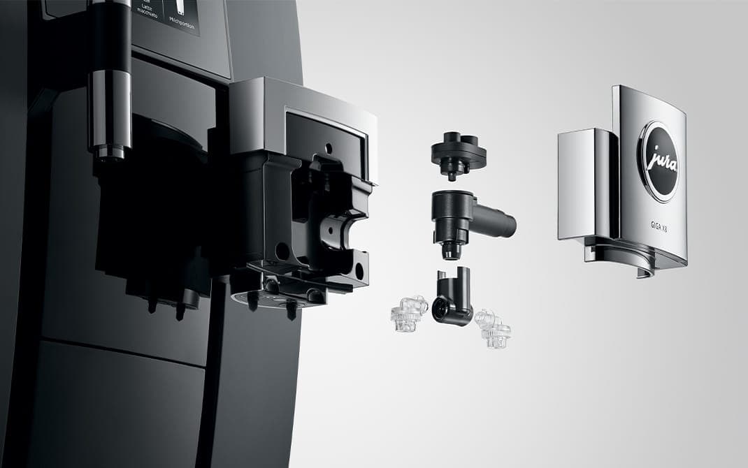 Genauso einfach, logisch und intuitiv wie die Bedienung funktioniert die Pflege der neuen GIGA X8. Original Pflegeprodukte von JURA sowie integrierte Spül- und Reinigungsprogramme sorgen für TÜV-zertifizierte Hygiene auf Knopfdruck. Ebenso durchdacht präsentiert sich die Milchsystemreinigung. Vollautomatisch und per Touch aufs Display gestartet, garantiert sie perfekte Sauberkeit im Umgang mit Milch. Der massive Kombiauslauf lässt sich mit wenigen Handgriffen zerlegen. Die darin vorn angeordneten Milchausläufe sind bequem zugänglich und können bei  Bedarf ganz einfach ersetzt werden.