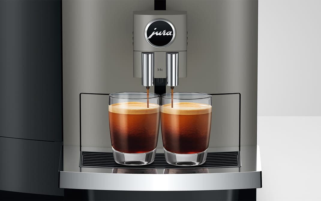 Die X4c bietet unvergleichlichen Kaffeegenuss. Sie mahlt die Kaffeebohnen mit dem Professional Aroma Grinder (P.A.G.2) und vereinigt drei innovative Brühprozesse von JURA. Mit der One-Touch-Lungo-Funktion gelingen Americanos wie Lungos aromatisch und mit charakteristischer Note. Der beliebte Café Crème profitiert von der 3D-Brühtechnologie und der Espresso schmeckt dank des Puls-Extraktionsprozesses (P.E.P.®) kräftig und ausgewogen.